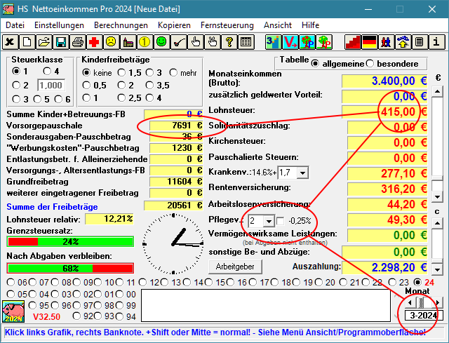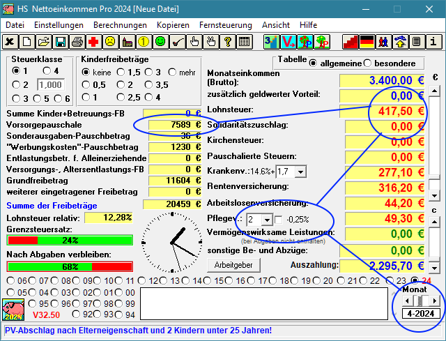 Mit Gültigkeit ab April 2024 hat das Bundesfinanzministerium eine neue Berechnung der Lohnsteuer festgelegt. Es ist nunmehr der geminderte Beitrag zur gesetzlichen Pflegeversicherung bei zwei oder mehr Kindern unter 25 Jahren auch bei der Berechnung der Vorsorgepauschale zu berücksichtigen. Da dadurch die steuerfreie Vorsorgepauschale sinkt, steigt im Gegenzu geringfügig die Lohnsteuer. Dies ist schlüssig, da bei einem verringerten steuerfreien Betrag, die Bemessungsgröße für die Lohnsteuer erhöht ist. Da dies in der im November verabschiedeten Fassung der Berechnungsvorschrift noch nicht enthalten war, ist nun auch eine neue Programmversion vonnöten. Hier sehen Sie die beispielhafte Auswirkung: Berechnung im März 2024